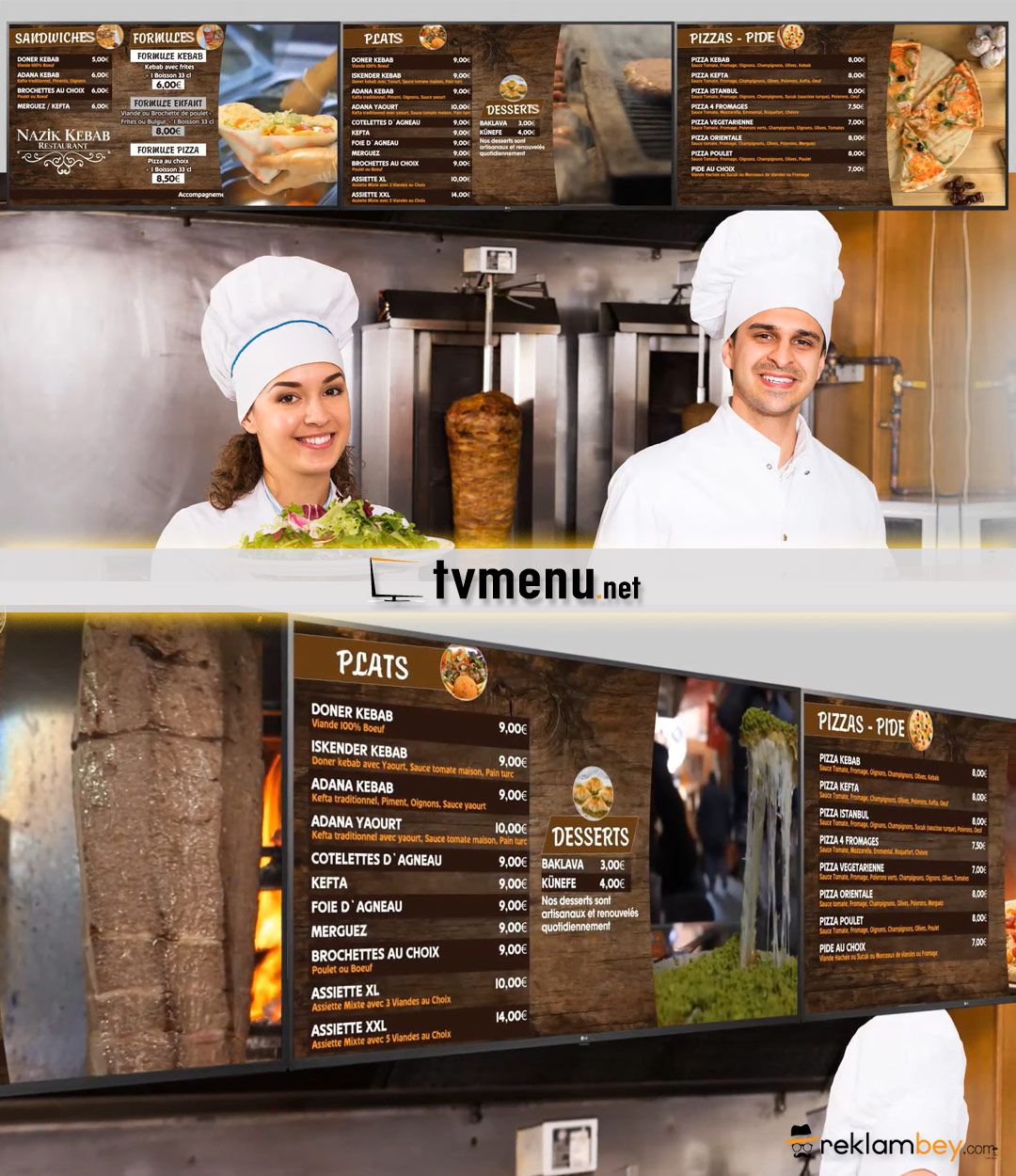Döner kebap / pizza ve diğer yemek sektöründe hizmet veren işletmelere yönelik televizyon üzerinde çalışan animasyonlu bir digital menü şeklidir.