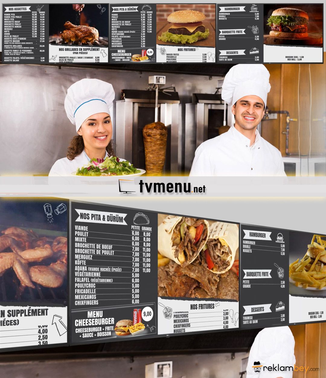 Döner kebap / pizza ve diğer yemek sektöründe hizmet veren işletmelere yönelik televizyon üzerinde çalışan animasyonlu bir digital menü şeklidir.