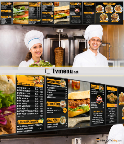Döner kebap / pizza ve diğer yemek sektöründe hizmet veren işletmelere yönelik televizyon üzerinde çalışan animasyonlu bir digital menü şeklidir.