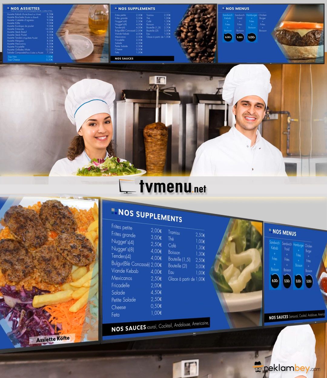 Döner kebap / pizza ve diğer yemek sektöründe hizmet veren işletmelere yönelik televizyon üzerinde çalışan animasyonlu bir digital menü şeklidir.