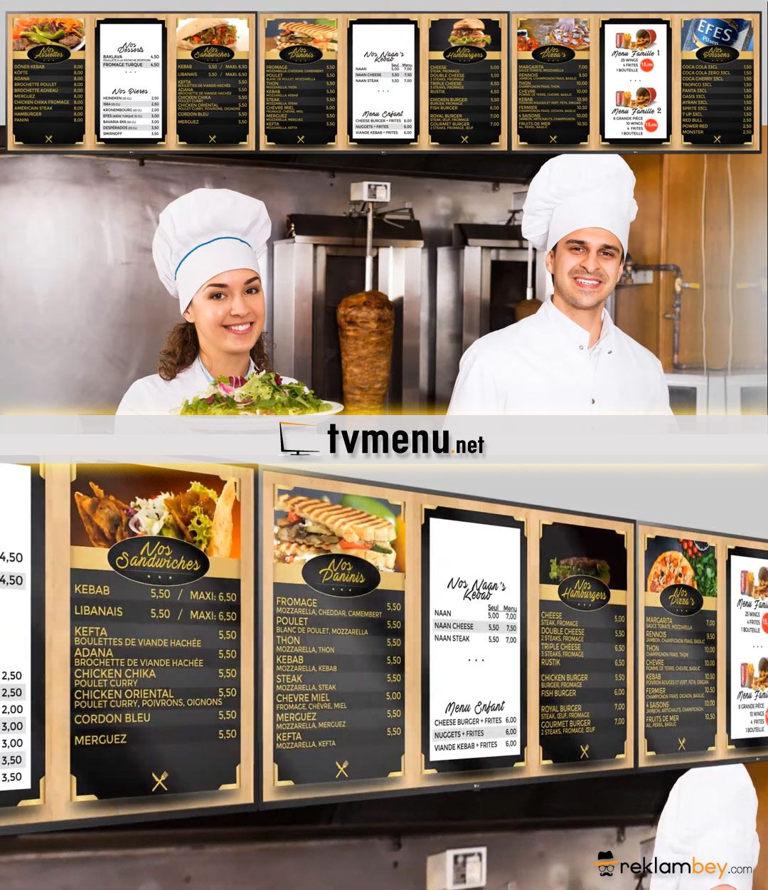 Döner kebap / pizza ve diğer yemek sektöründe hizmet veren işletmelere yönelik televizyon üzerinde çalışan animasyonlu bir digital menü şeklidir.