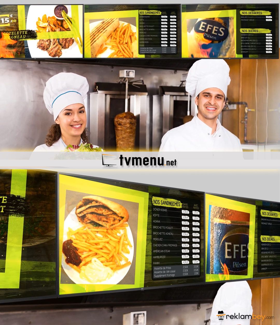 Döner kebap / pizza ve diğer yemek sektöründe hizmet veren işletmelere yönelik televizyon üzerinde çalışan animasyonlu bir digital menü şeklidir.