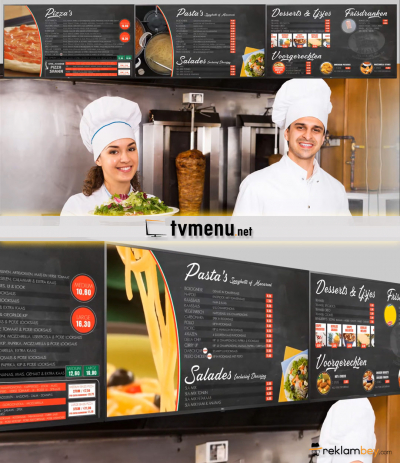 Döner kebap / pizza ve diğer yemek sektöründe hizmet veren işletmelere yönelik televizyon üzerinde çalışan animasyonlu bir digital menü şeklidir.