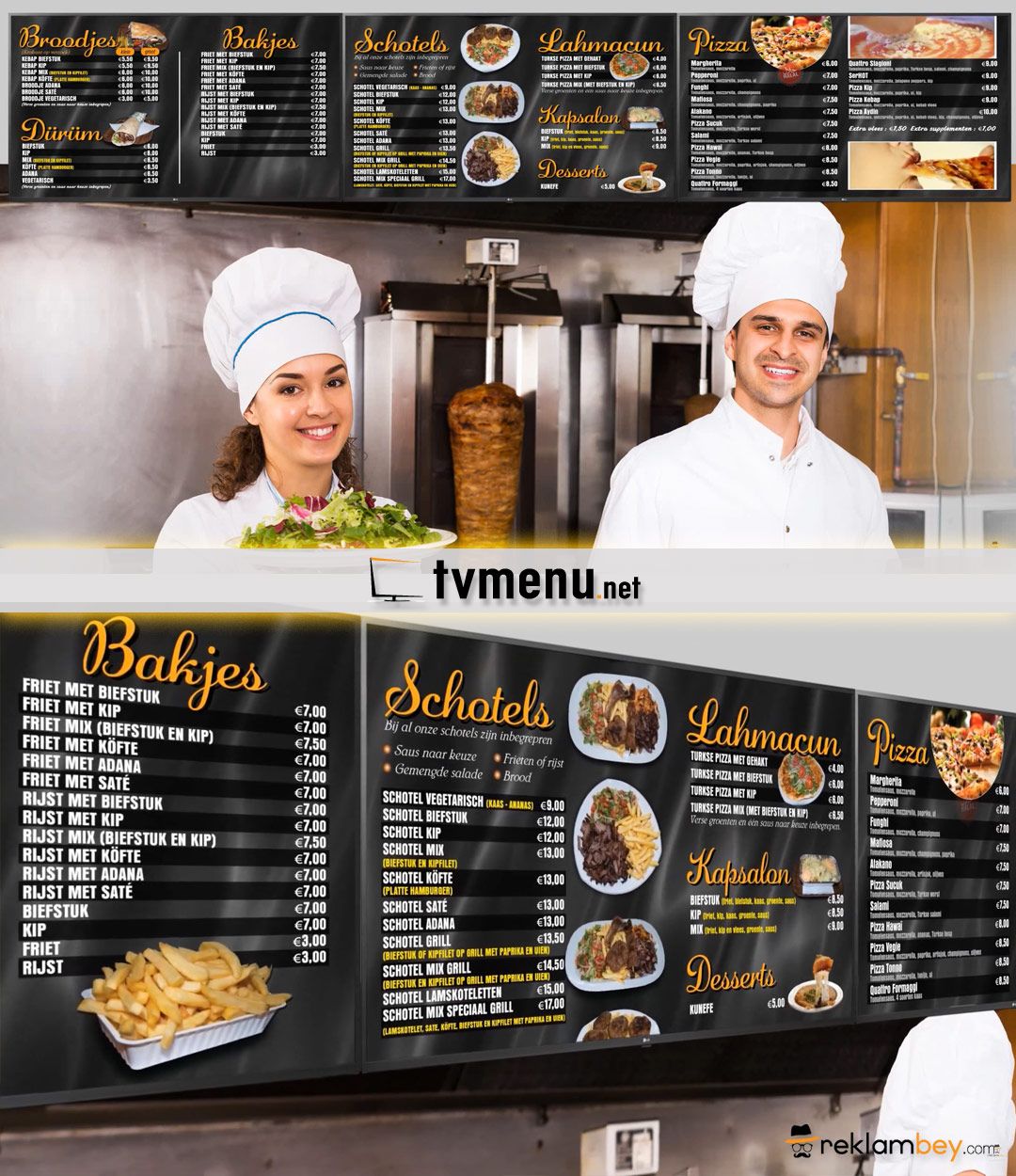 Döner kebap / pizza ve diğer yemek sektöründe hizmet veren işletmelere yönelik televizyon üzerinde çalışan animasyonlu bir digital menü şeklidir.