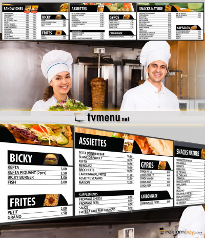 Döner kebap / pizza ve diğer yemek sektöründe hizmet veren işletmelere yönelik televizyon üzerinde çalışan animasyonlu bir digital menü şeklidir.
