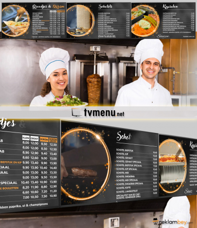 Döner kebap / pizza ve diğer yemek sektöründe hizmet veren işletmelere yönelik televizyon üzerinde çalışan animasyonlu bir digital menü şeklidir.
